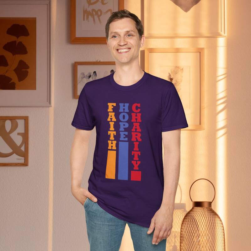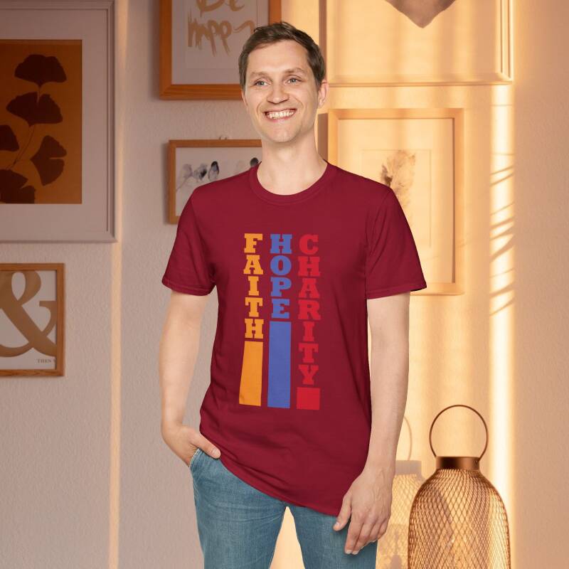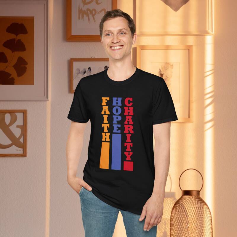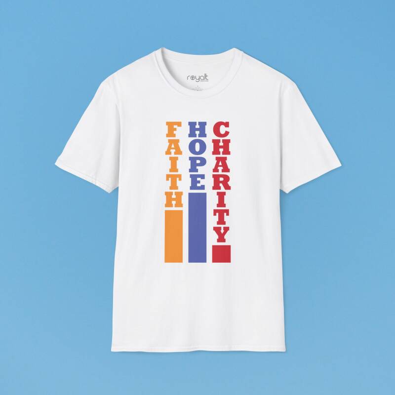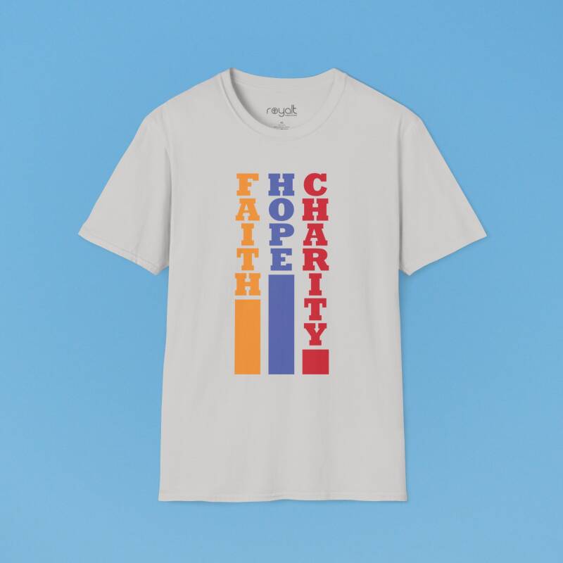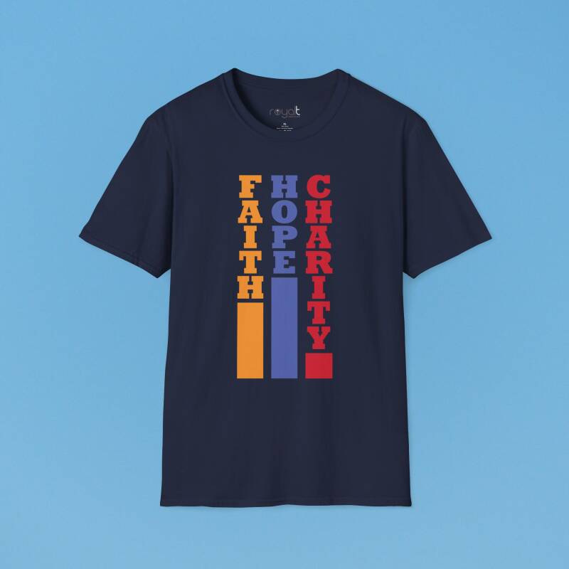 Wear the core of Christian living with this elegant “Faith Hope Charity” T-shirt—an everyday reminder of the virtues that anchor our walk with Christ.