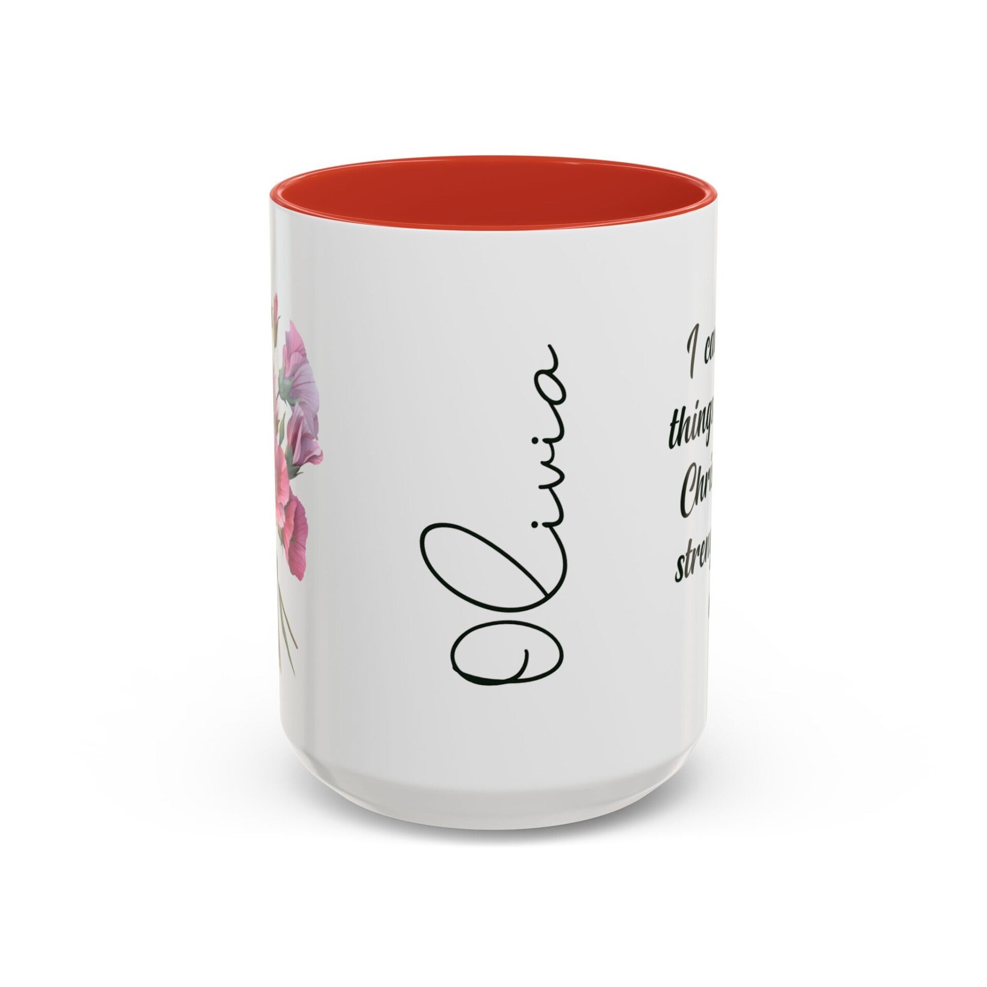 Empower every sip with this customizable mug featuring a vibrant flower bouquet and the inspiring verse “I Can Do All Things Through Christ Which Strengtheneth Me”—a beautiful blend of encouragement, faith, and personal touch.